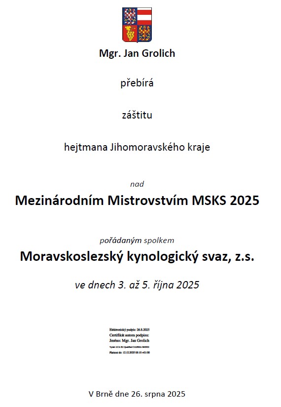 Již tradičně nad Mezinárodním Mistrovstvím MSKS převzal záštitu Hejtman Jihomoravského kraje Mgr. Jan Grolich.